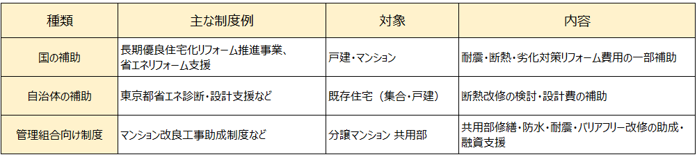 まず押さえておきたいのが、国と自治体、そして管理組合を通じた制度があり、「個人の住戸の改修だけでなく、マンション全体の共用部にも補助が出る」ケースが少なくない、という点です。以下に代表的な制度をご紹介します。