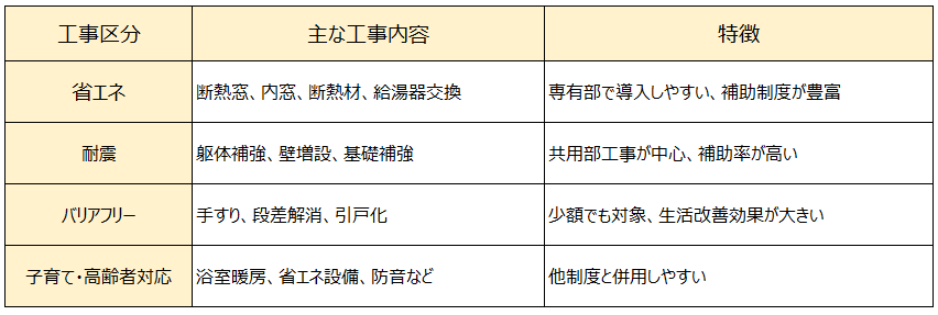 特に、省エネ、耐震、バリアフリー、子育て・高齢者関連の分野は国・自治体ともに支援が手厚く、マンションでも実施しやすい工事が多く含まれています。