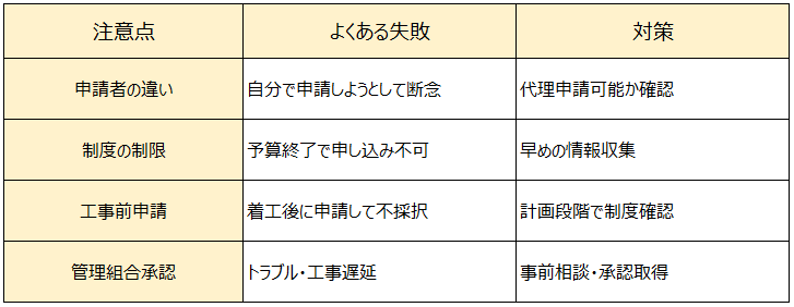 制度内容を理解せずに工事を進めてしまうと、本来受けられた補助を逃してしまうケースがあるため注意が必要です。