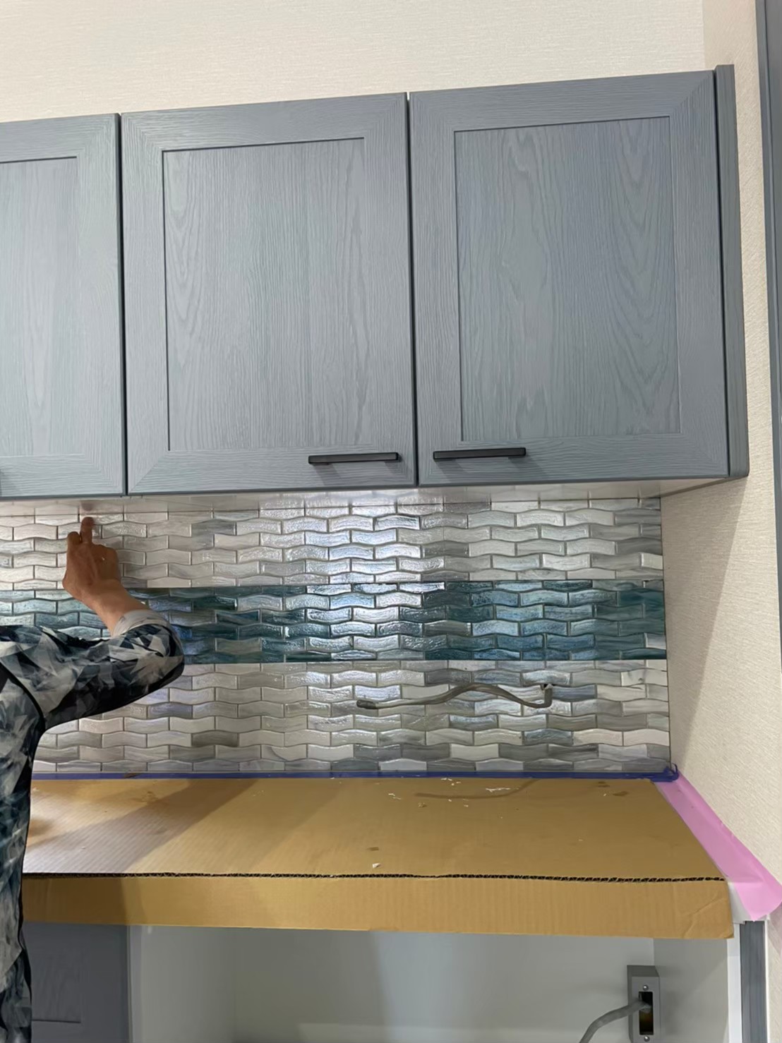 キッチンのお色と合わせてブルー系のタイルを貼っていきます!